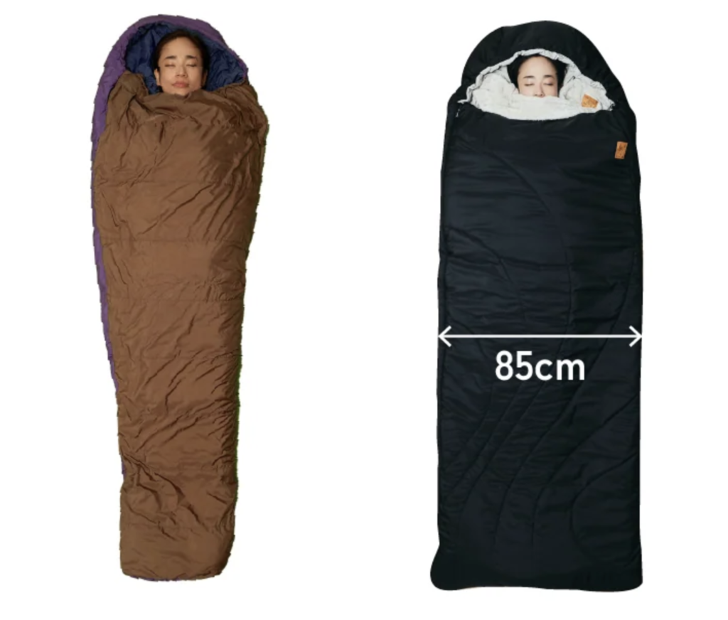 マミー型は余計な隙間がないので暖かいのが利点ですが、身体から足元にかけて幅が狭くなっているので、窮屈な感じが筆者は苦手でした。