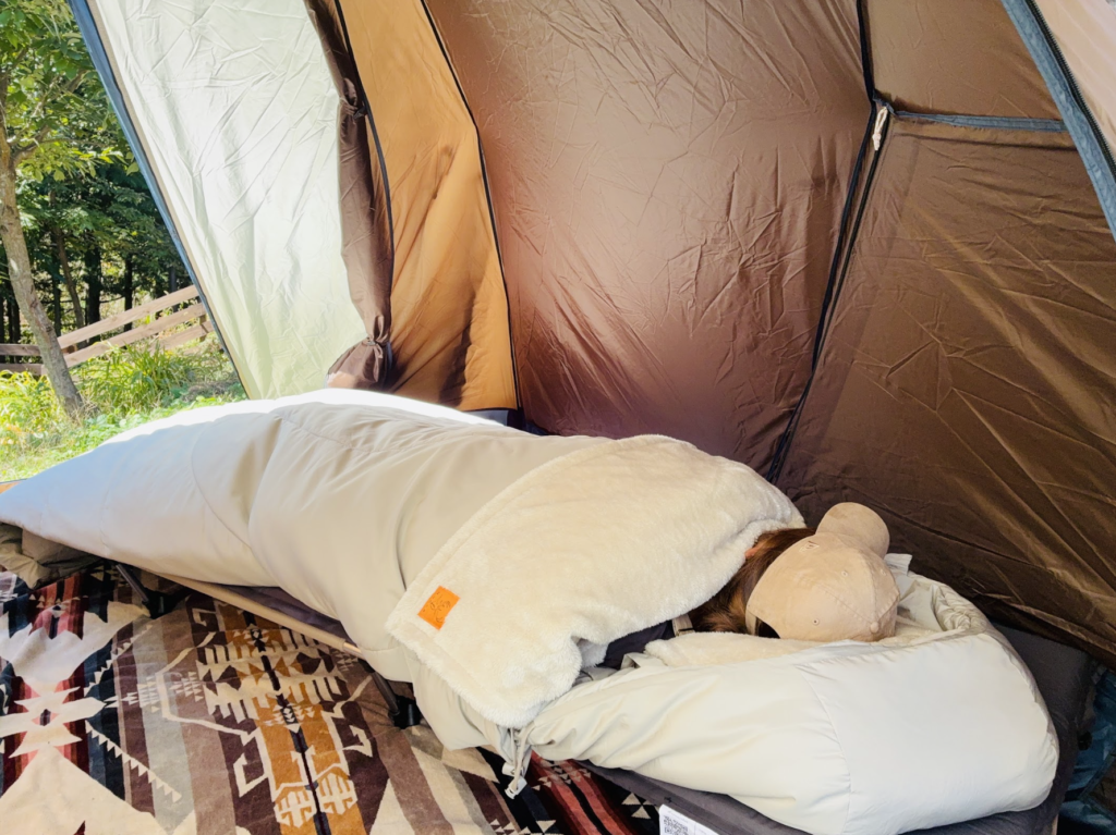 実際に外気温5度のテントの中でお昼寝をしてみましたが、薄手のロングTシャツ1枚だけでもシュラフに入ってしまえばとても温かく、全く冷気を通しませんでした。