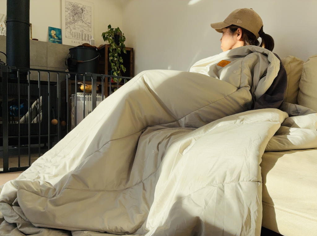 逆に室内利用では暖かすぎるので、シュラフに入るというより、ソファなどで寝たときの掛け布団代わりに使うのがよさそうです。