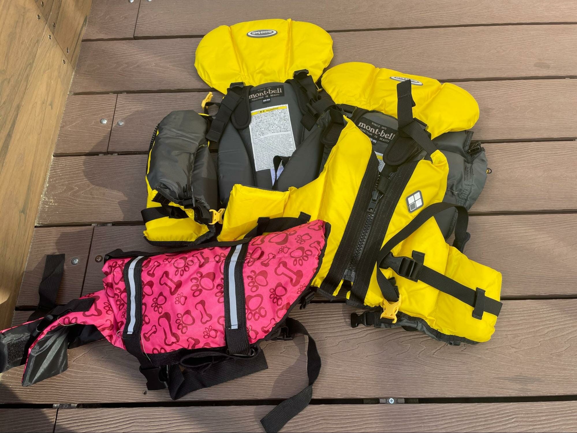 ペットを連れて行く場合はペット用のライフジャケットも忘れずに。写真左下は犬用のライフジャケットです。