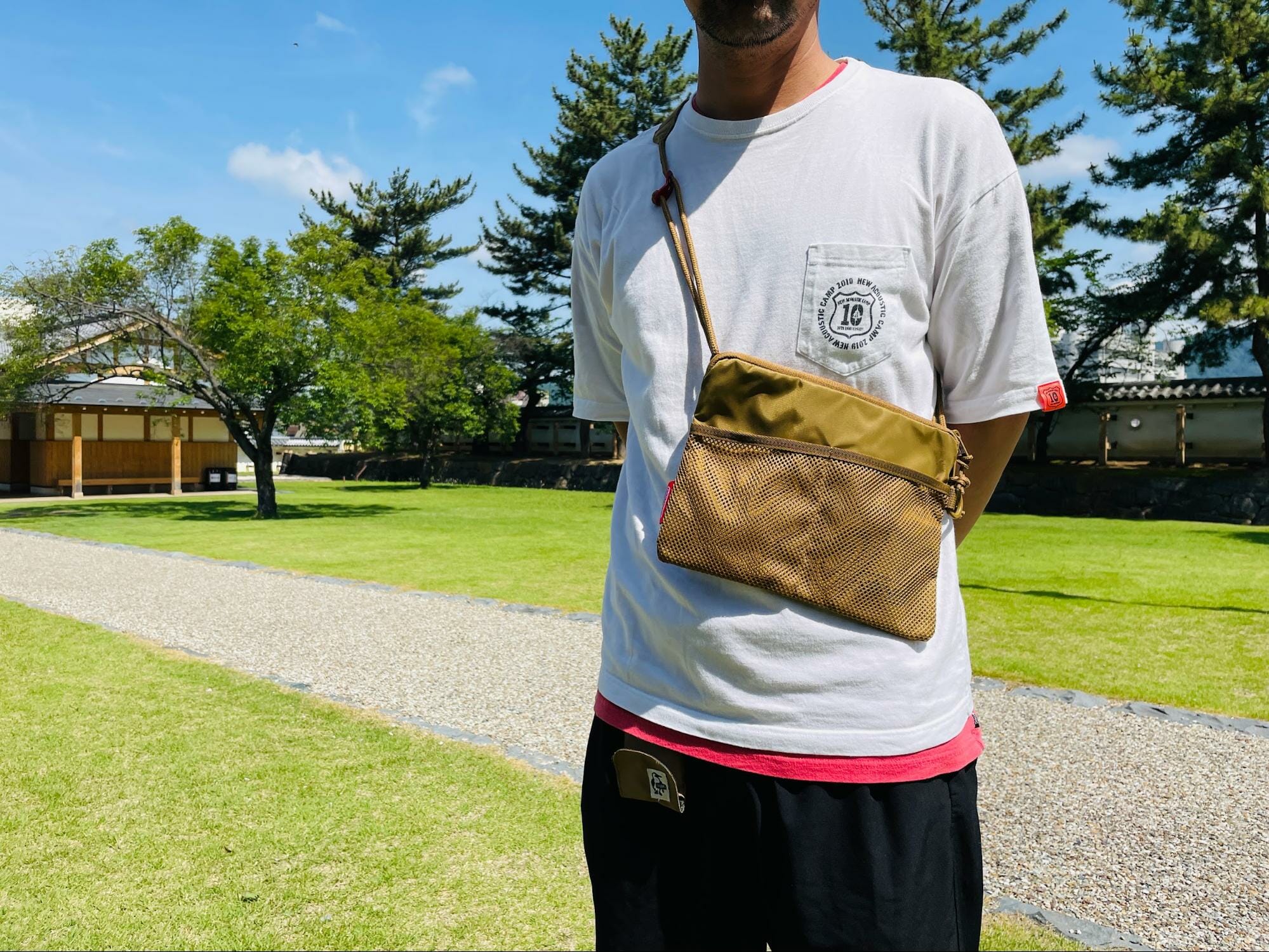 実際に肩からかけてみると、思ったよりもかさばらず、サコッシュ自体の型崩れもあまり感じません。