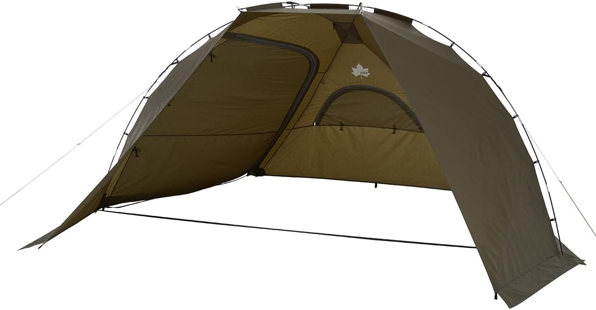 メッシュ切り替え可能な前後ドアや火の粉に強い素材、簡単な設営ガイドリボン付きで利便性も抜群。夏場の快適性やカンガルーテントとの相性も良く、多用途に使用可能なワンルームスタイルのシェルターです。