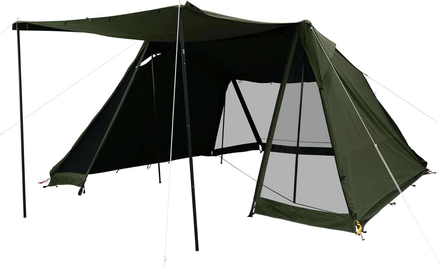 クラシックなロッジ型デザインが特徴的な大型シェルター。耐火性と通気性に優れたTC素材を採用し、夏は涼しく冬は暖かく過ごせます。