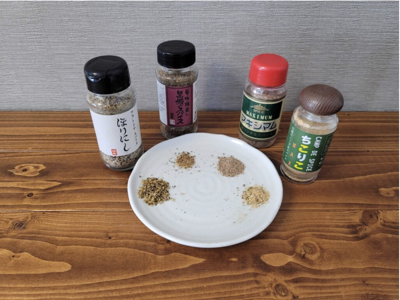 約15種類の調味料とスパイスでつくられていて、コショウ強めのどんな食材にも合うピリ辛万能スパイス。ハーブの風味が強く出ていて、醤油ベースの味わい。ガーリック風味が食欲をそそり、甘味もあるおいしいスパイスでした。
