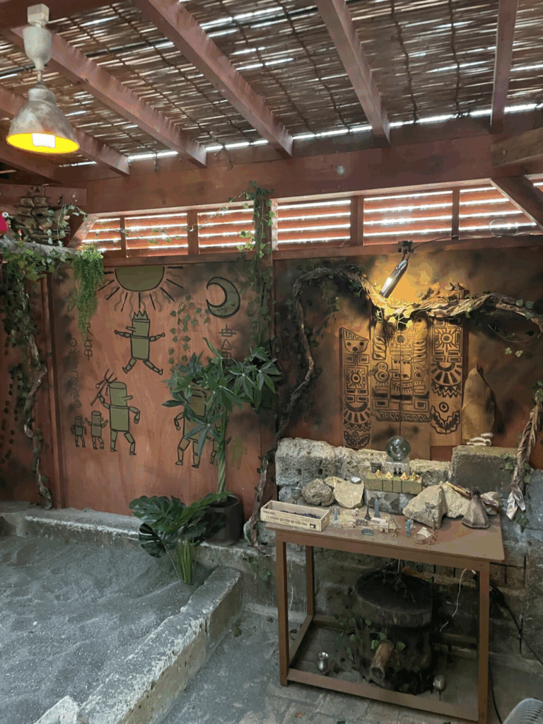 サンゴや恐竜の骨の化石(レプリカ)を探す発掘体験が楽しめるのが「ジュラシックハント」。木や岩で囲まれた発掘ゾーンは、まるで古代の遺跡。