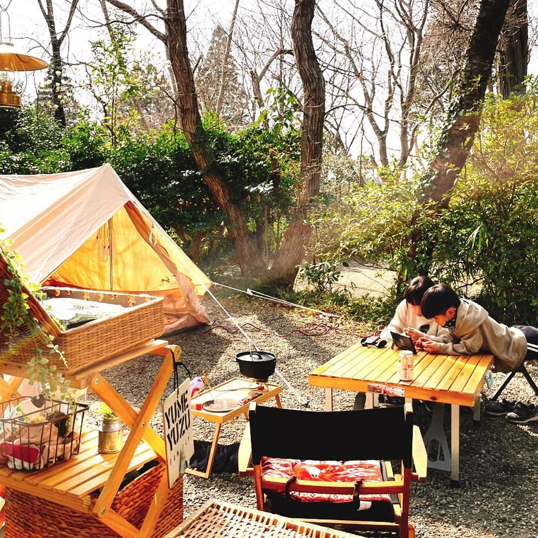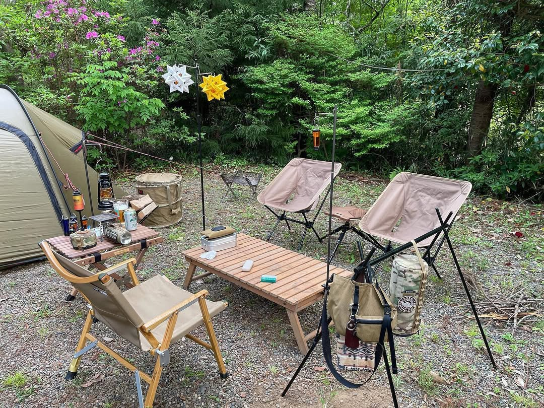 キャンプサイトにナチュラルなウッドローテーブルはナチュラルな雰囲気のキャンプサイトと相性抜群です。