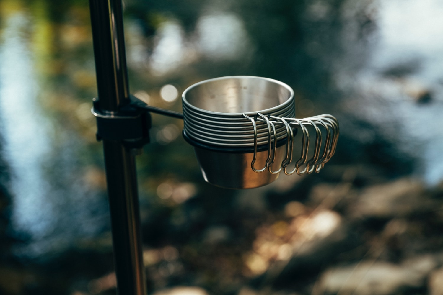 コズハンガー同様、ポールに簡単に取り付けることができるカップ用ホルダーです。シリコーンバンドの簡単装着に、φ30とφ32の2サイズ展開。カップだけでなく、シェラカップホルダーとしても使用でき、ゼインアーツのステンレスシェラカップやチタニウムシェラカップなら10個まで重ねて乗せることができ、サイズが合えば他社製品も置くことができます。タンブラー用のアダプターが付属していますので置くことも可能です。おすすめのタンブラーはゼインアーツのスタッキングタンブラーなら問題なく置くことができ、置けない物もありますが、他社製品でも使用できます。タンブラーやシェラカップの中に一緒に重ねられるカトラリーROOBEを置いておくのもいいでしょう。