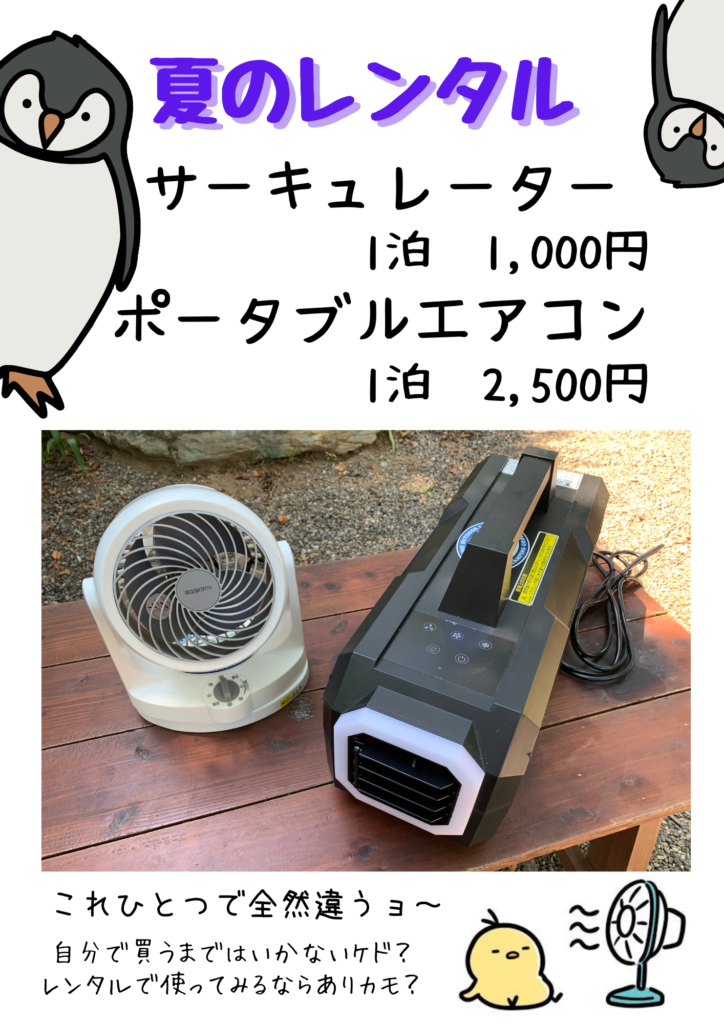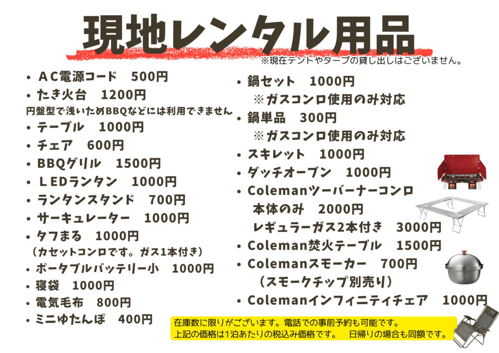 現地でのレンタル品は、在庫に限りがございます。混雑日の場合は事前電話予約がおすすめです。